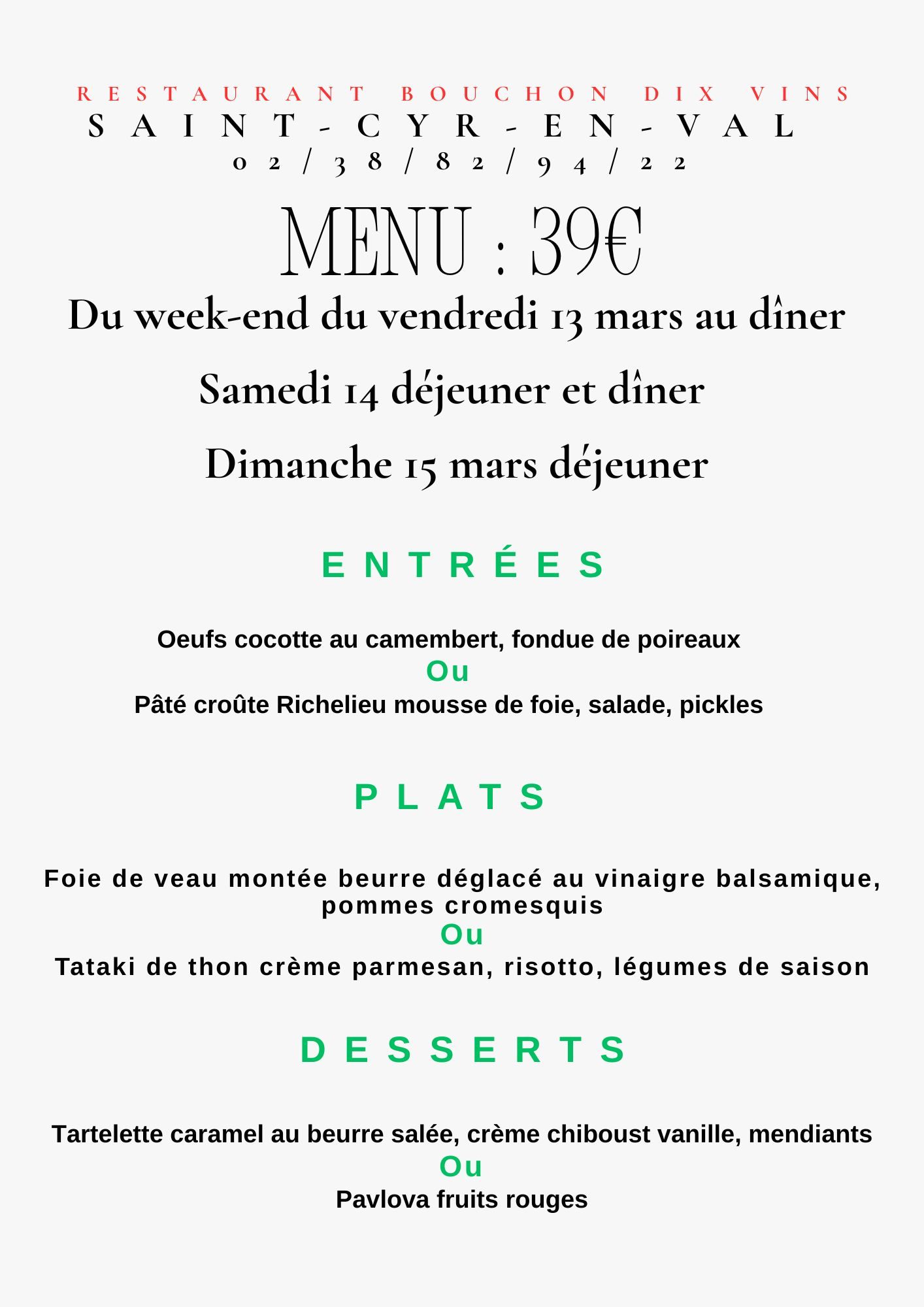 Restaurant ouvert dimanche 15 mars 2026 - Menu : 39€ servi tout le week-end